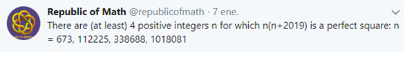 En las tres entradas referidas a este tema hemos buscado el valor de n que consigue que n(n+k) sea un cuadrado. Si planteamos el problema inverso, si dado un n ver si existe un k que cumpla la misma condición, con lo visto en párrafos anteriores tenemos la respuesta, pues vimos que n(n+3n) es un cuadrado, luego existe solución para todo n.